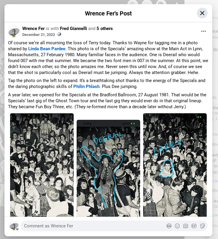 Believe it or not, before they had even met, Dee and Larry were photographed together. Well—they were both featured in an amazing crowd shot some months earlier. The photo, taken by Philin Phlash at the Specials’ show on 27 February 1980 at The Main Act in Lynn, MA, captured both of them just feet apart in the audience, sharing the same charged musical moment. They had no idea they’d soon be band mates. They probably didn’t notice each other at all. The photo itself wasn’t surfaced until decades later, but in hindsight, it’s proof that they were already drawn to the same scene, same bands, same energy—orbiting the same world before their paths crossed. Dee, mid-jump—a truly extraordinary jump, part of what makes the whole photo great. And Larry, not jumping, but caught in the crowd, eyes fixed on Lynval and Terry on stage. You can see it for yourself, just below. And, little did either know, but they’d be sharing a stage with the Specials in the near future.